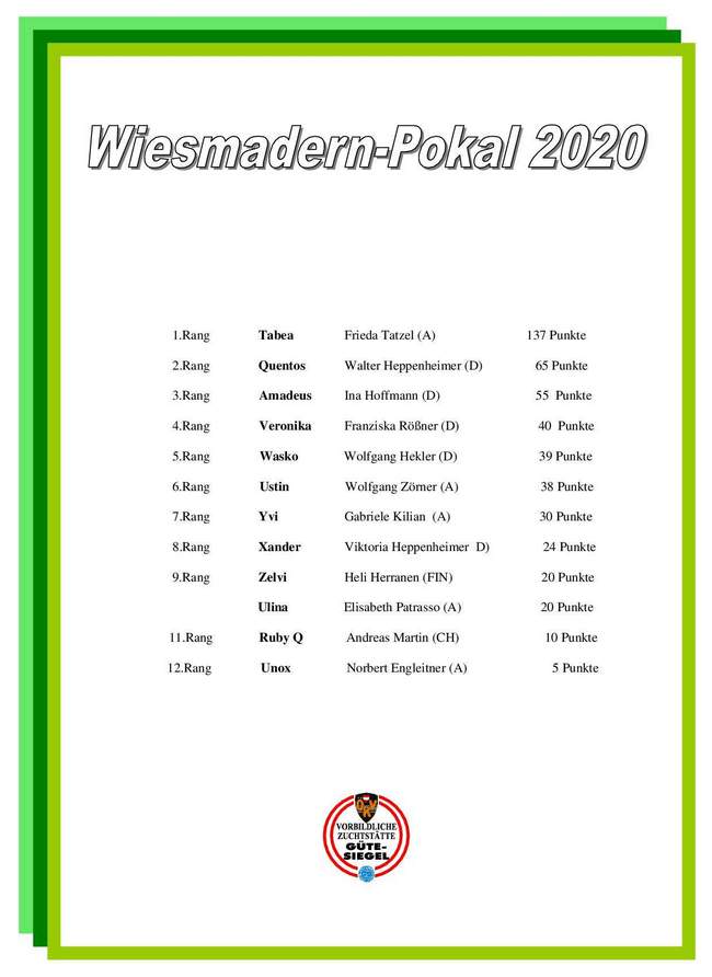 Liebe Freunde der Wiesmadern-Hunde,hier ist der Wiesmadern-Pokal 2020. Ich möchte mich bei allen sehr herzlich bedanken, die ihre Hunde im abgelaufenen Jahr trotz vieler Hindernisse so erfolgreich präsentiert haben.
